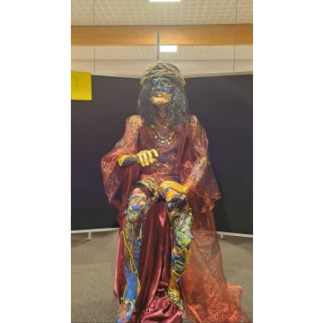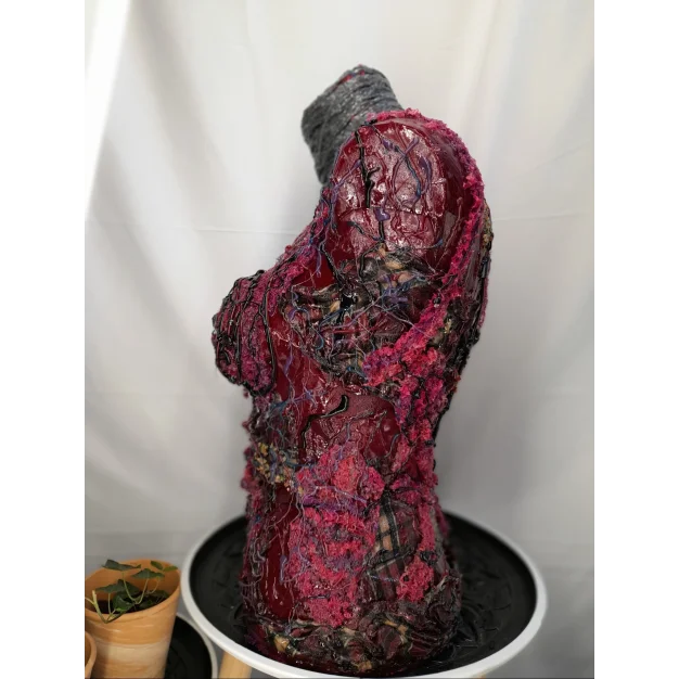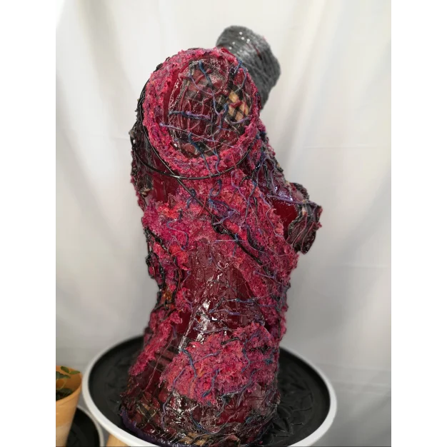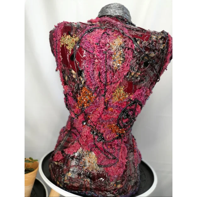 I didn't want my old clothes go to waste and started to brainstorm how I could transform them. This is the result. Moreover the intrigue not to waste things but use it for something else. My core focus is to create the rocky and rough look. It may look fine due the feminine display but it really isn't. It is very abstract. It doesn't portray any message, philosophy or anything.