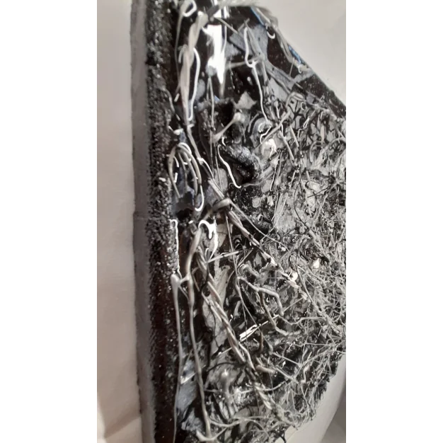 J'étais intéressé de savoir ce que cela donnerait si j'attachais des fils industriels en métal sur la toile. Cela a créé une dynamique intéressante avec le tissu. Cela a donné une dimension supplémentaire une fois que la peinture a été ajoutée, finie avec de la résine époxy.