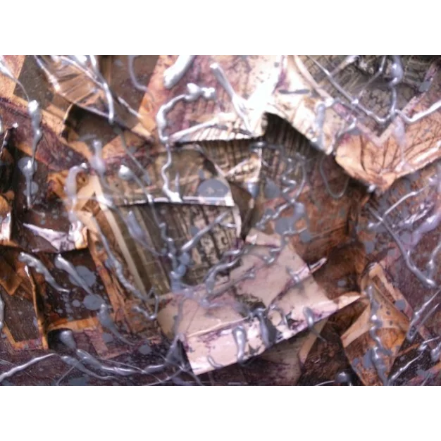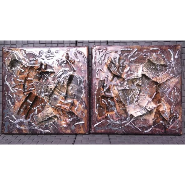 Les toiles sont faites avec du vieux carton et des cartes postales vintage/antiques des années 1950 ou 1960. Les images des cartes postales ont des représentations religieuses de bâtiments architecturaux catholiques et de sanctuaires. La couleur des vieilles cartes postales est sépia. La base des toiles est constituée des vieux cartons et du café. Les cartes postales sont en essence moulées/sculptées dessus. Fini avec de la peinture acrylique et de la colle en caoutchouc fondue et de la résine époxy.